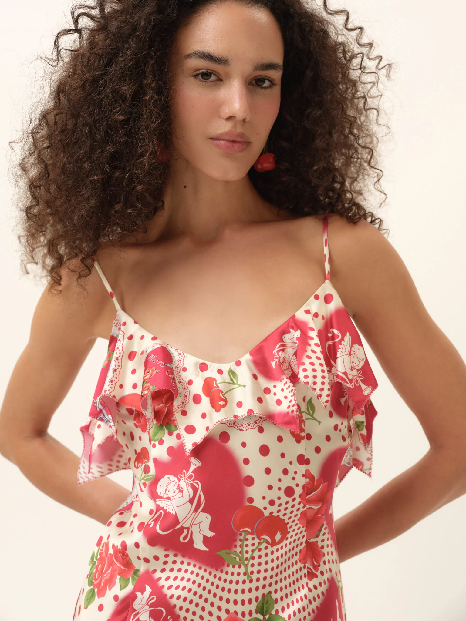 A love story in a dress. A kitschy Cupid-and-hearts print brings instant charm to this asymmetrical midi dress, while its ruffled hem and v-neckline create a playfully romantic look—making it the ultimate Valentine’s Day dress.