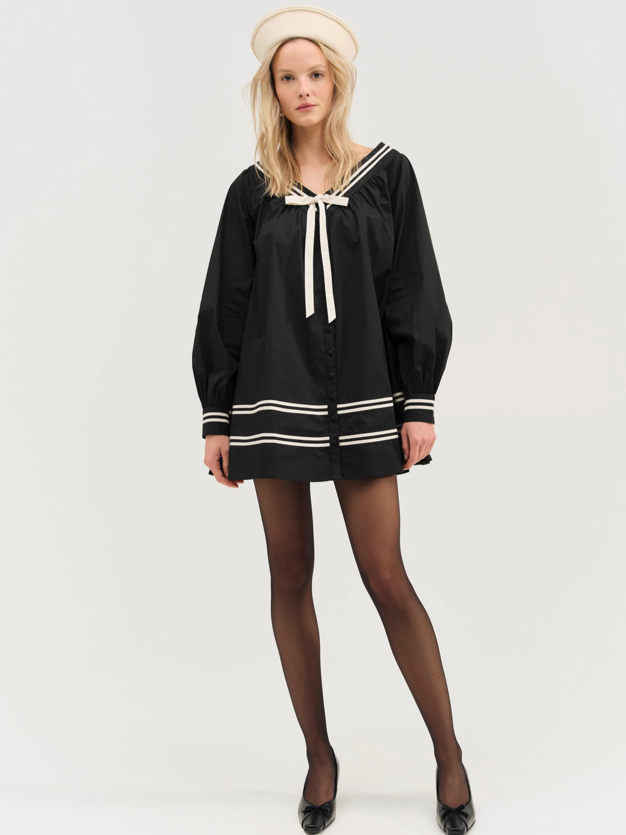The Helena Poplin long sleeve mini dress is a playful nod to a timeless aesthetic. Crafted in a crisp poplin, this babydoll dress spotlights nautical contrast piping details, functional center-front buttons, and a contrast tie at the neckline.