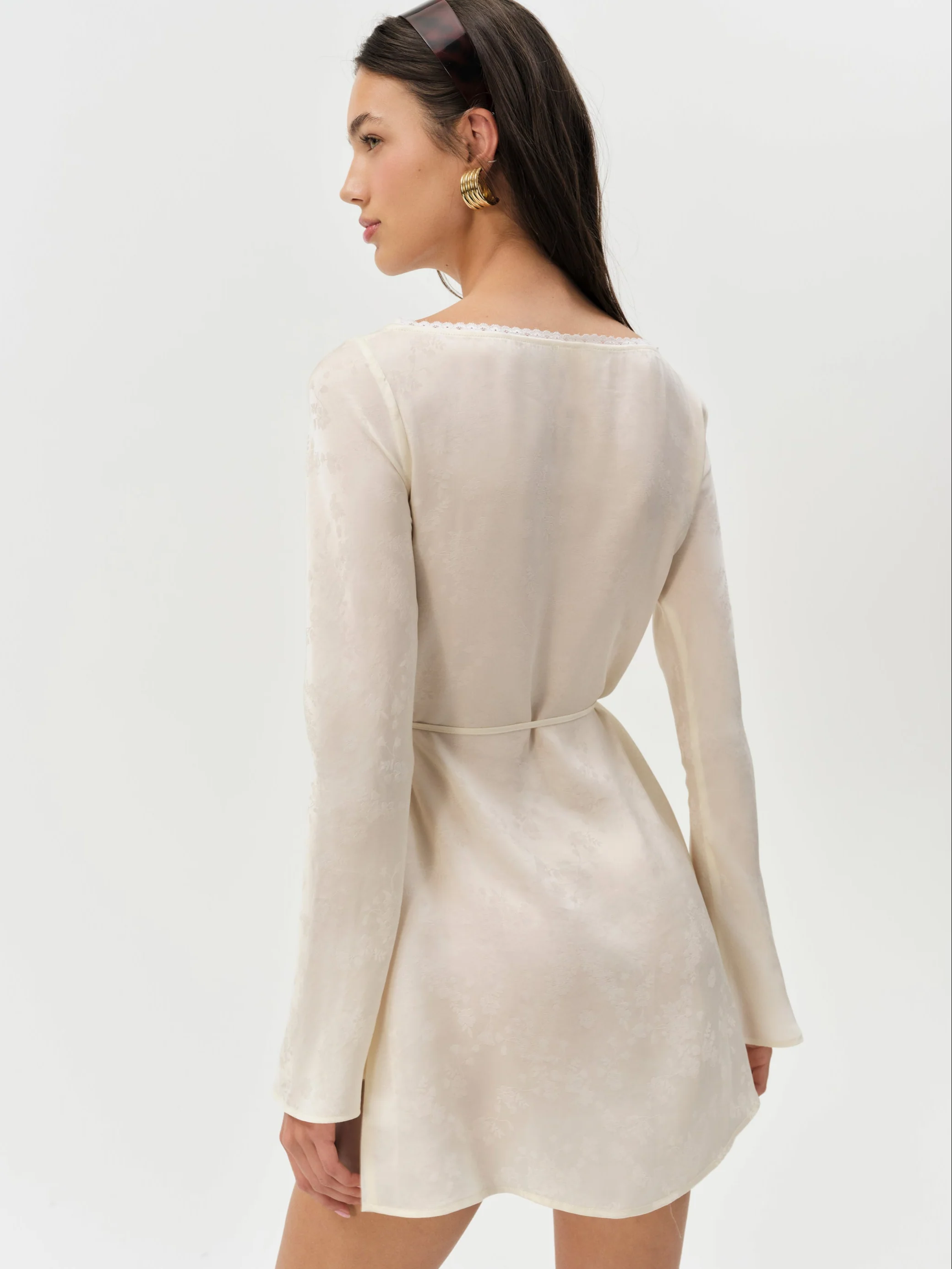 Become the vintage Muse with the Madalie long sleeve mini dress—a boat neck dress crafted in a floral jacquard that spotlights bell sleeves, lace trims, and a functional tie at waist.