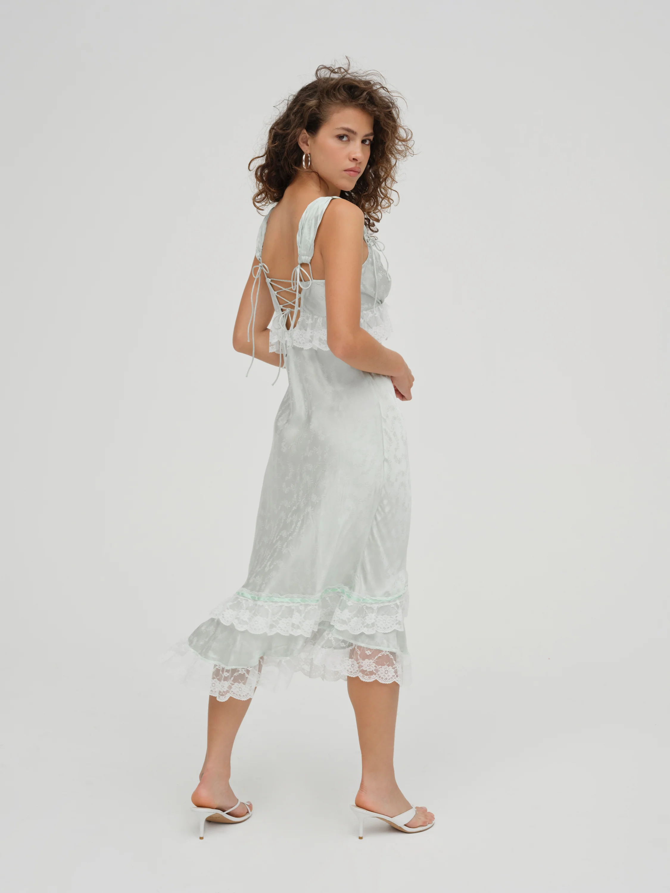 Inspired by vintage lingerie, the Mint Twist midi slip dress exudes old-time charm. Crafted in a floral jacquard, this bias-cut slip features functional buttons, gathered sleeves, and ruffled lace trims.