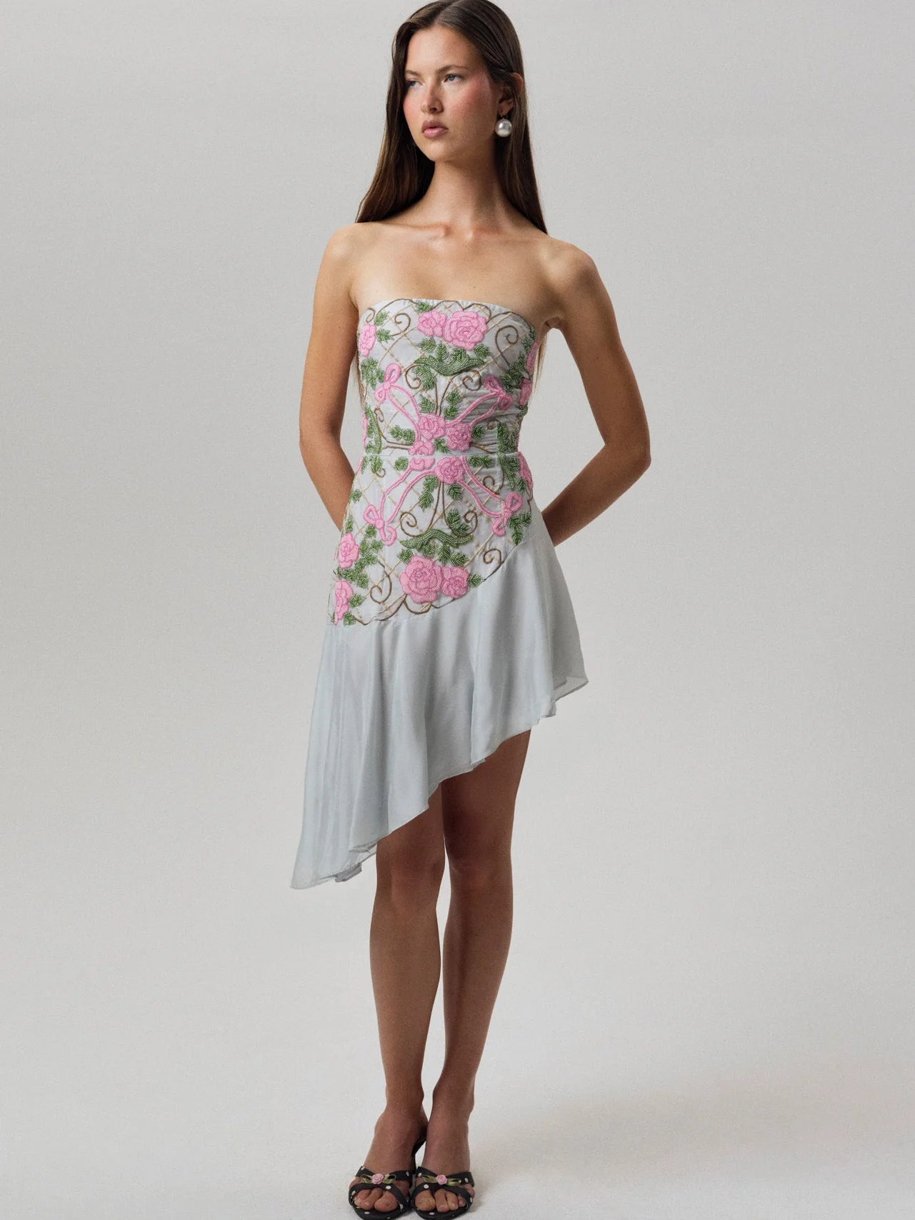 An ethereal asymmetric floral midi dress complete with a sculpted bodice and exquisite rose embroidery. The Rosie Bow Midi Dress brings a whisper of enchantment to any spring ensemble—a strapless beauty designed to make any moment feel magical.